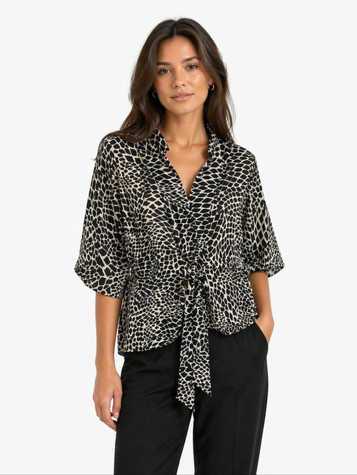 Emma James Black and White Geometric Design Blouse Front Tie Size 14— Preloved
